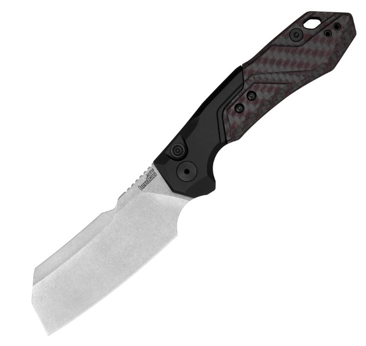 Automatic opening. 4.38" (11.13cm) closed. 3.38" (8.59cm) stonewash finish CPM-154 stainless cleaver style blade. Black anodized aluminum handle with Black and red carbon fiber onlay. Lanyard hole. Pocket clip. Boxed.